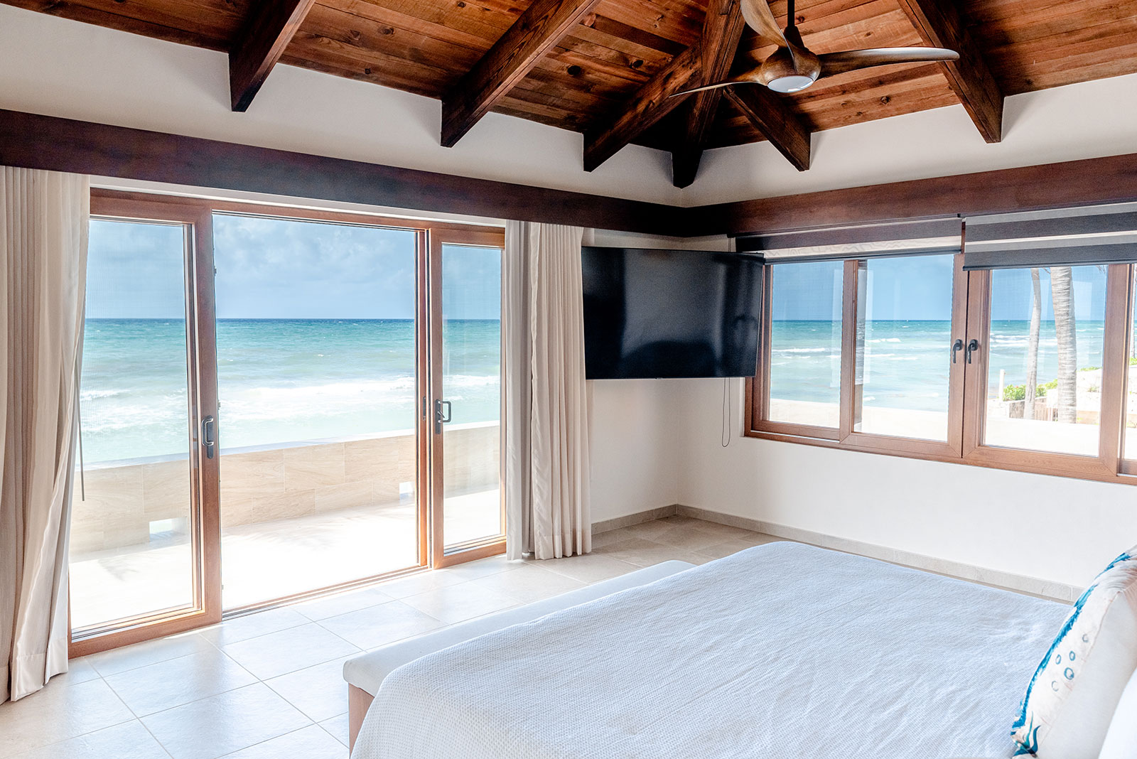 All four bedrooms are furnished with plush king-size beds, and three include stylish ensuite bathrooms. The upper floor balconies frame stunning ocean views, ensuring you’re always connected to the sea. Just beyond the terrace, the pristine beach serves as the villa’s most captivating feature.